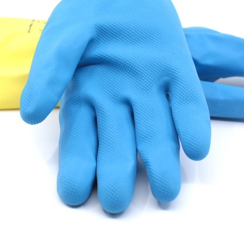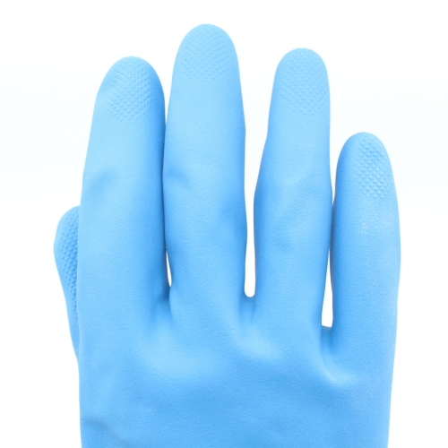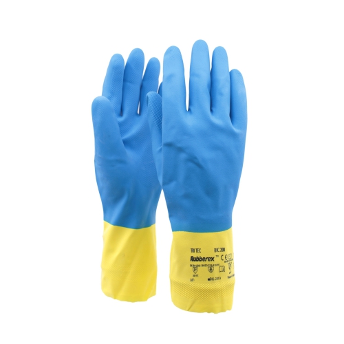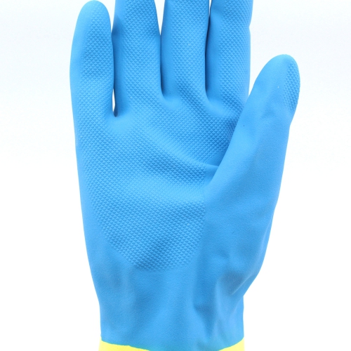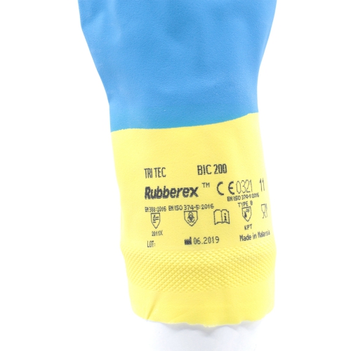 Kemskyddshandske i latex med dubbla lager gummi över hela handen. Den något tjockare handsken ger extra bra slitstyrka och kemikalieresistens. Bra grepp i både våta och oljiga miljöer. Bomullsflossad insida för hög komfort. Godkänd för livsmedelshantering. Handsken är silikonfri.